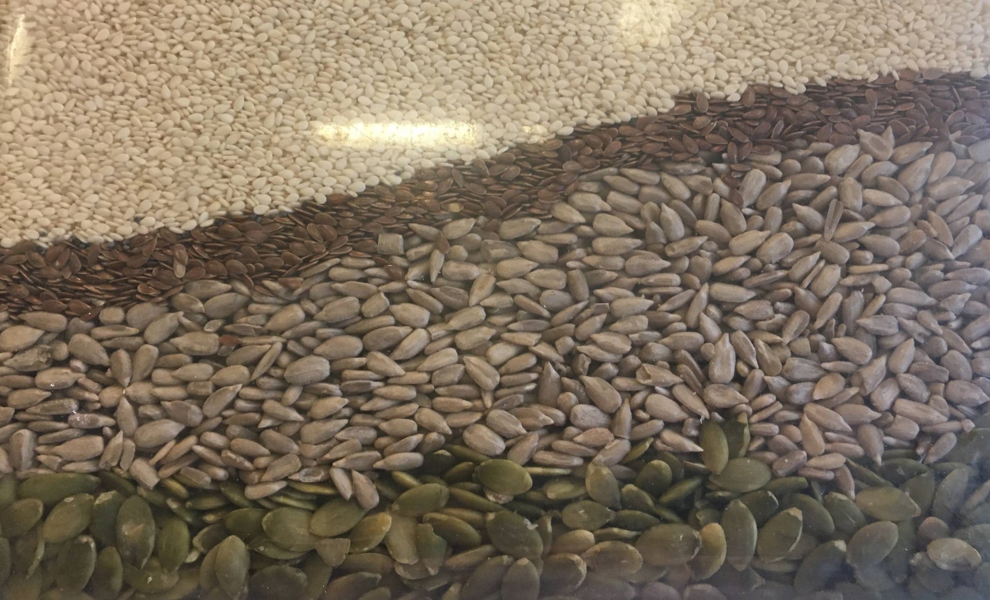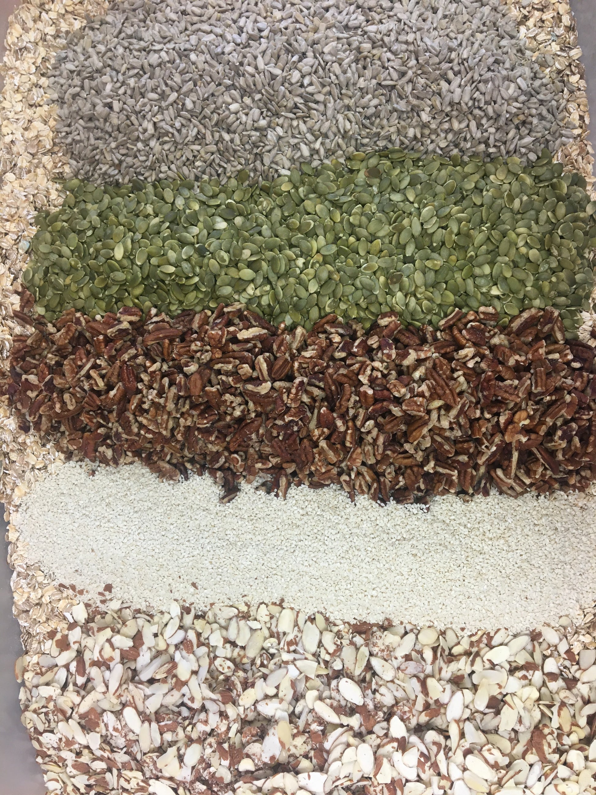 Rolled Oats, Wheat Flakes, Rye Flakes, Pecan Halves, Pumpkin Seeds, Sunflower Seeds, Sesame Seeds, Sliced Almonds are roasted and sweetened with honey and dried cranberries or raisins are added at the end.